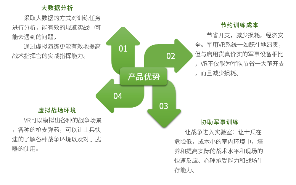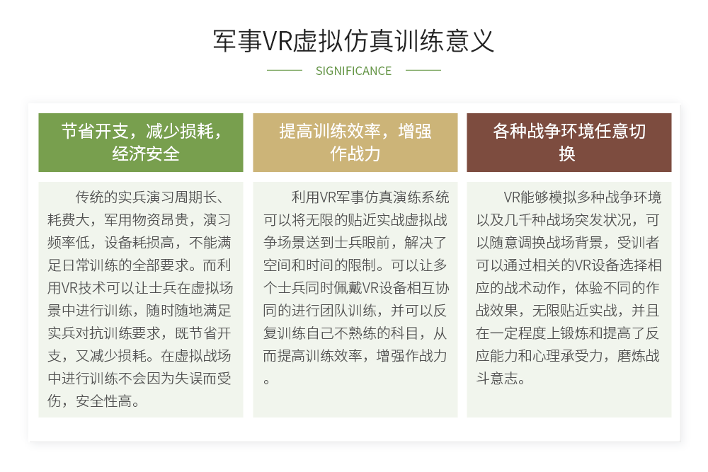 节省开支,减少损耗,经济安全。军用VR系统一如既往地昂贵,但与启用货真价实的军事设备相比,VR不仅能为军队节省一大笔开支,而且减少损耗。采取大数据的方式对训练任务进行分析,能有效的规避实战中可能会遇到的问题。通过虚拟演练更能有效地提高战术指挥官的实战指挥能力。VR可以模拟出各种的战争场景,各种的枪支弹药,可以让士兵快速的了解各种战争环境以及对于武器的使用。协助军事训练:让战争进入实验室:让士兵在危险低,成本小的室内环境中,培养和提高实际的战术水平和现场的快速反应、心理承受能力和战场生存能力。
