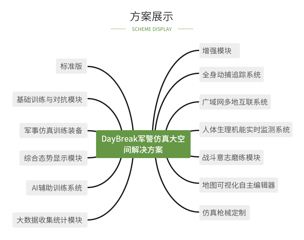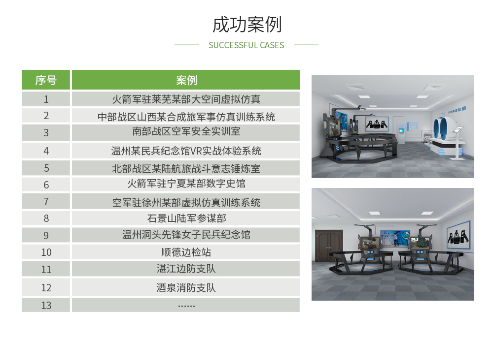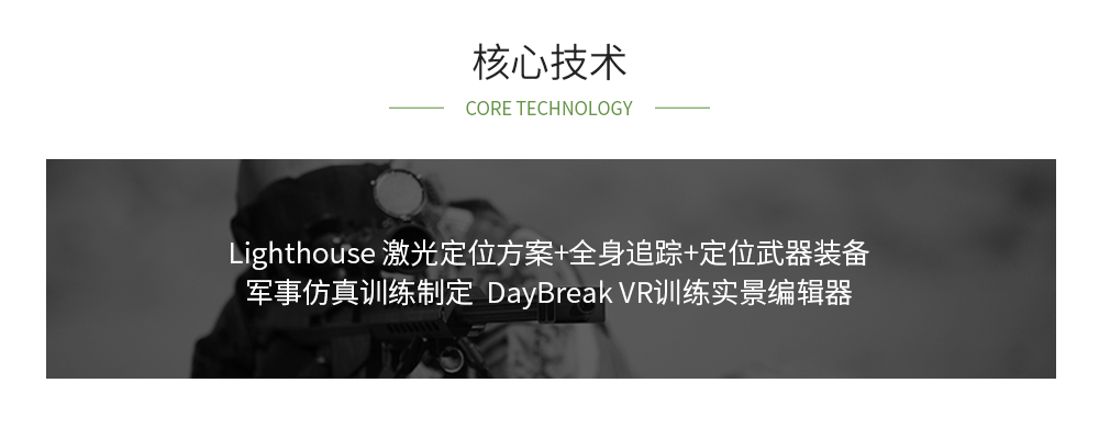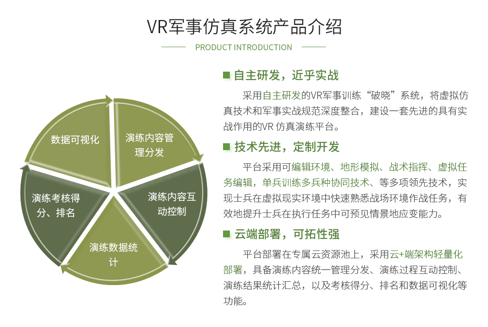 VR军事仿真系统;采用自主研发的VR军事训练“破晓”系统,将虚拟仿真技术和军事实战规范深度整合,建设一套先进的具有实战作用的VR 仿真演练平台。