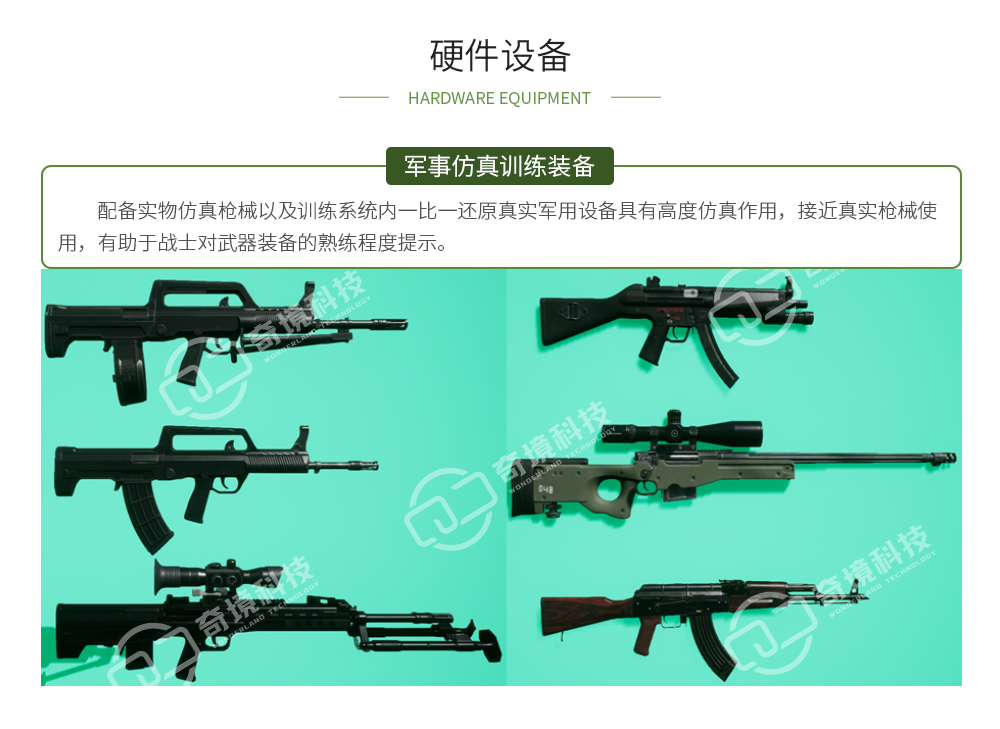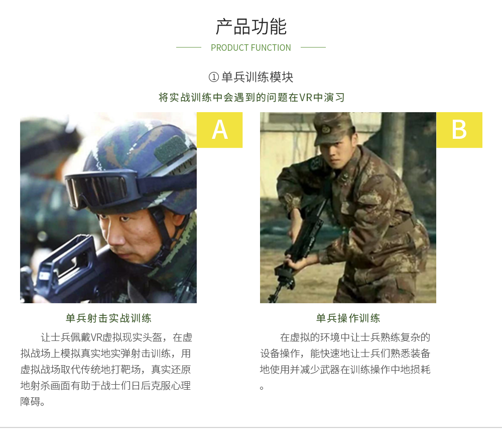 单兵射击实战训练:让士兵佩戴VR虚拟现实头盔,在虚拟战场上模拟真实地实弹射击训练,用虚拟战场取代传统地打靶场,真实还原地射杀画面有助于战士们日后克服心理障碍。单兵操作训练:在虚拟的环境中让士兵熟练复杂的设备操作,能快速地让士兵们熟悉装备地使用并减少武器在训练操作中地损耗。
