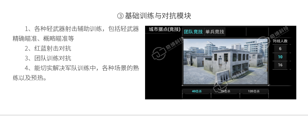 1、各种轻武器射击辅助训练,包括轻武器精确瞄准、概略瞄准等2、红蓝射击对抗3,团队训练对抗。能切实解决军队训练中,各种场景的熟练以及预热。