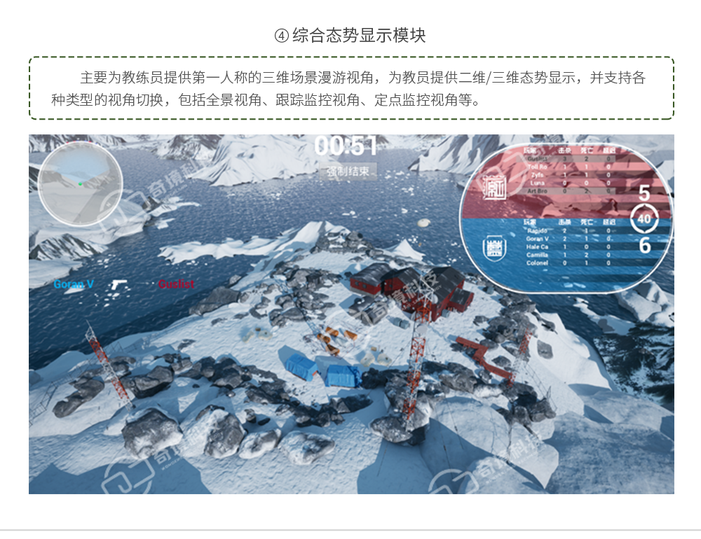 主要为教练员提供第一人称的三维场景漫游视角,为教员提供二维/三维态势显示,并支持各种类型的视角切换,包括全景视角、跟踪监控视角、定点监控视角等。