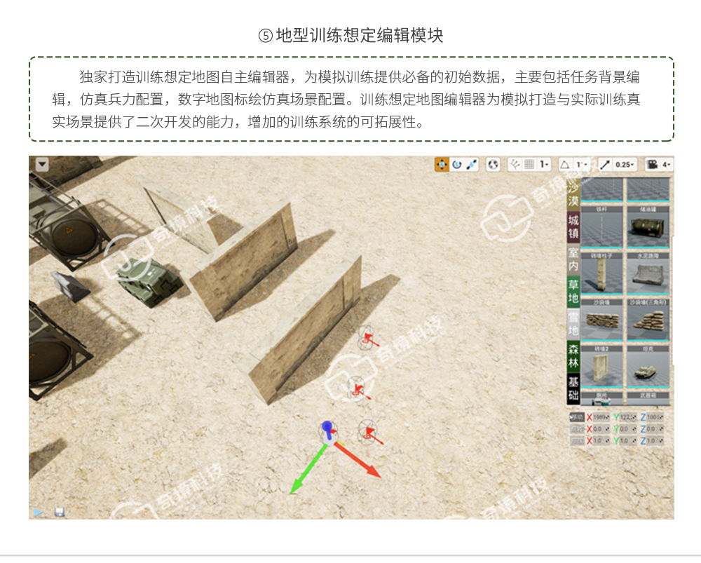 地型训练想定编辑模块:独家打造训练想定地图自主编辑器,为模拟训练提供必备的初始数据,主要包括任务背景编辑,仿真兵力配置,数字地图标绘仿真场景配置。训练想定地图编辑器为模拟打造与实际训练真实场景提供了二次开发的能力,增加的训练系统的可拓展性。