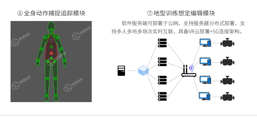全身动作捕捉追踪模块;广域网多地互联系统模块:软件服务端可部署于公网,支持服务器分布式部署,支持多人多地多场次实时互联,具备VR云部署+5G连接架构。