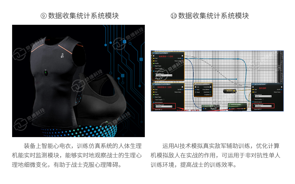 人体生理机能实时监测系统模块:装备上智能心电衣,训练仿真系统的人体生理机能实时监测模块,能够实时地观察战士的生理心理地细微变化,有助于战士克服心理障碍。AI辅助训练系统模块:运用AI技术模拟真实敌军辅助训练,优化计算机模拟敌人在实战的作用,可运用于非对抗性单人训练环境,提高战士的训练效率。
