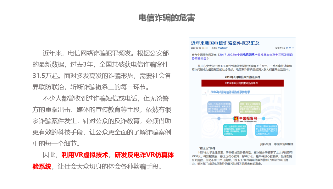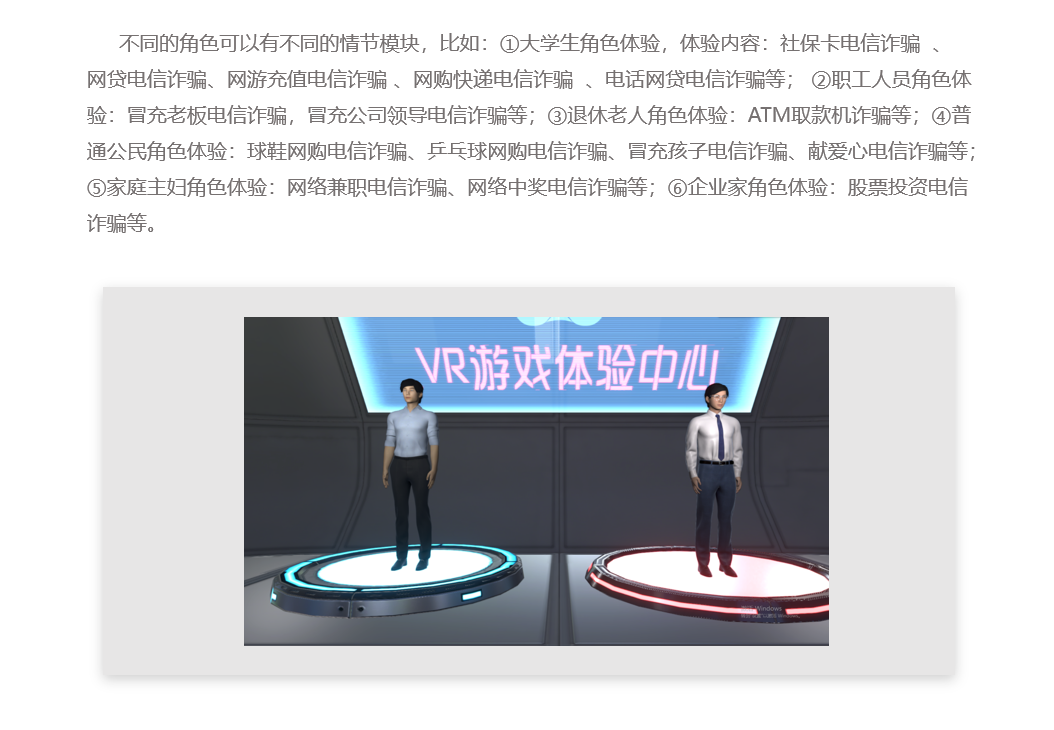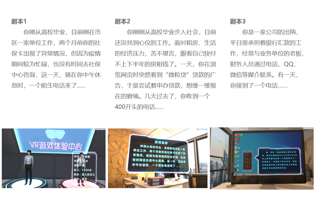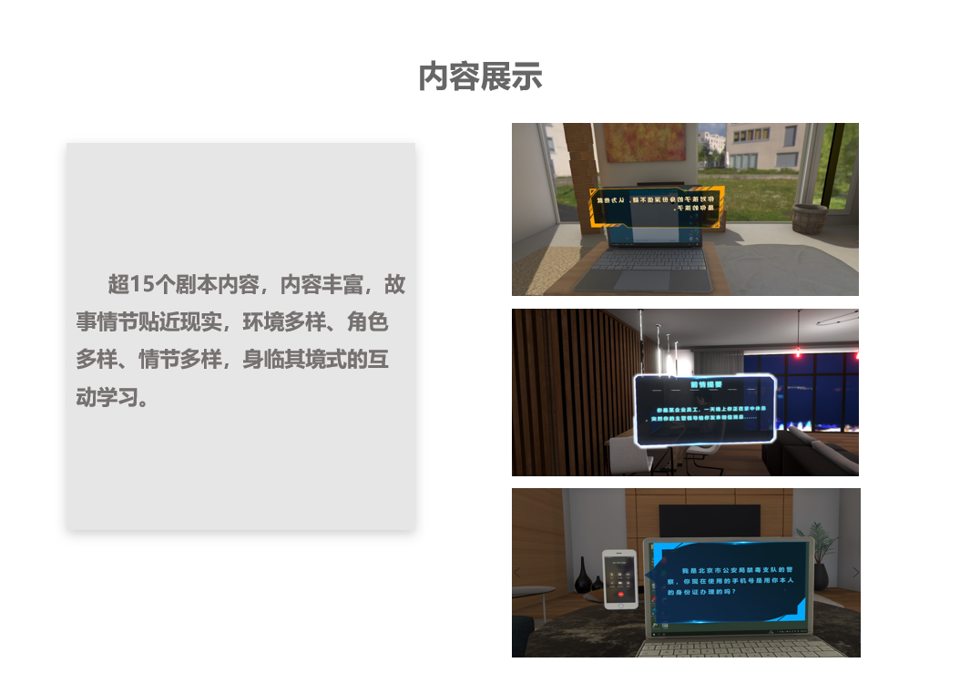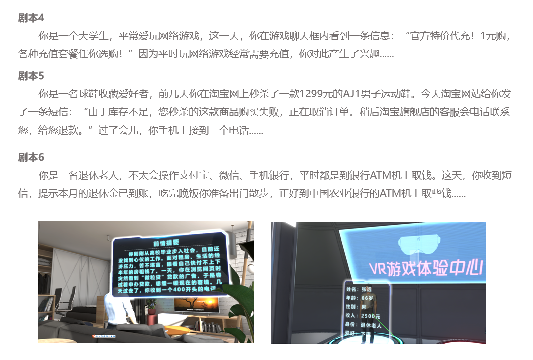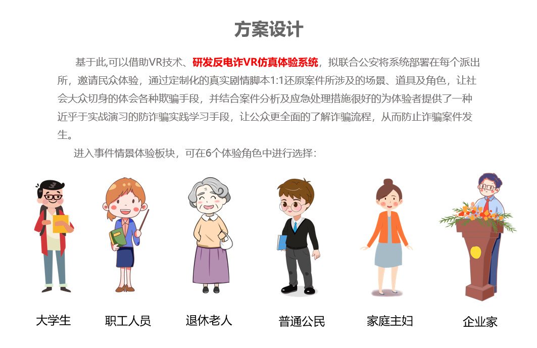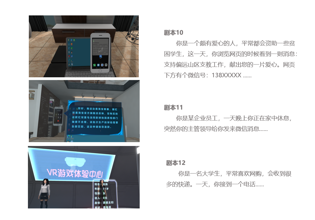 可以借助VR技术、研发反电诈VR仿真体验系统,拟联合公安将系统部署在每个派出所,邀请民众体验,通过定制化的真实剧情脚本1:1还原案件所涉及的场景、道具及角色,让社会大众切身的体会各种欺骗手段,并结合案件分析及应急处理措施很好的为体验者提供了一种近乎于实战演习的防诈骗实践学习手段,让公众更全面的了解诈骗流程,从而防止诈骗案件发生。
