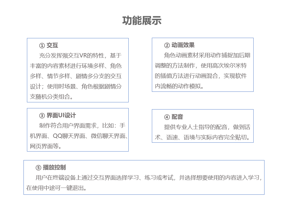 交互:充分发挥强交互VR的特性,基于丰富的内容素材进行环境多样、角色多样、情节多样、剧情多分支的交互设计;使用时场景、角色根据剧情分支随机分类组合。动画效果:角色动画素材采用动作捕捉加后期调整的方法制作,使用高次埃尔米特的插值方法进行动画混合,实现软件内流畅的动作模拟。界面UI设计:制作符合用户界面需求,比如:手机界面、QQ聊天界面、微信聊天界面、网页界面等。