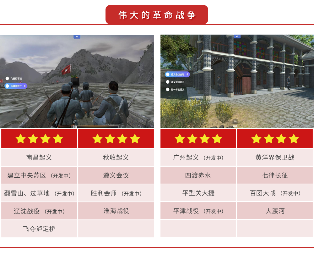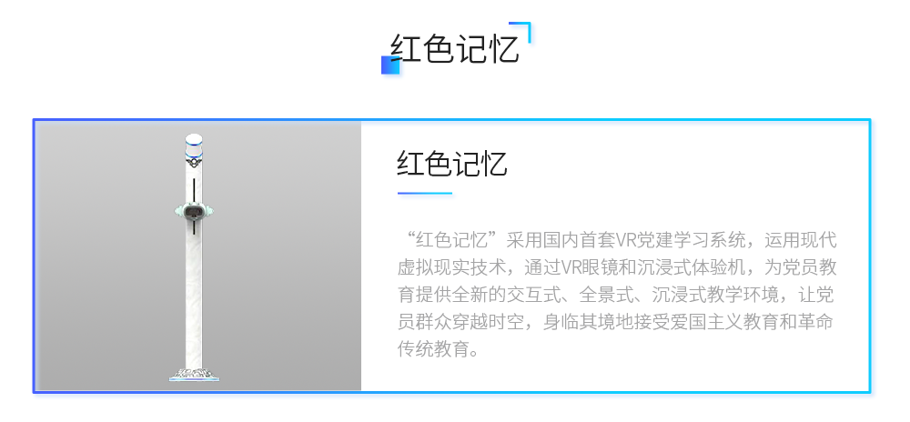 “红色记忆”采用国内首套VR党建学习系统,运用现代虚拟现实技术,通过VR眼镜和沉浸式体验机,为党员教育提供全新的交互式、全景式、沉浸式教学环境,让党员群众穿越时空,身临其境地接受爱国主义教育和革命传统教育。