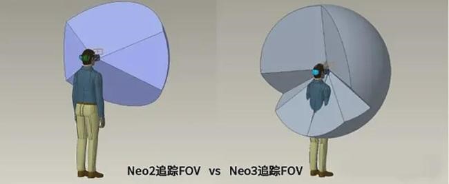 定位方面,Pico Neo 3煞费苦心,基于四广角镜头的空间定位技术,在头显前端采用4路超广角追踪传感摄像头,分布在头显正面四角处,使得整体追踪范围能达到238°x195°,基本包含了正前方与周围的面积。