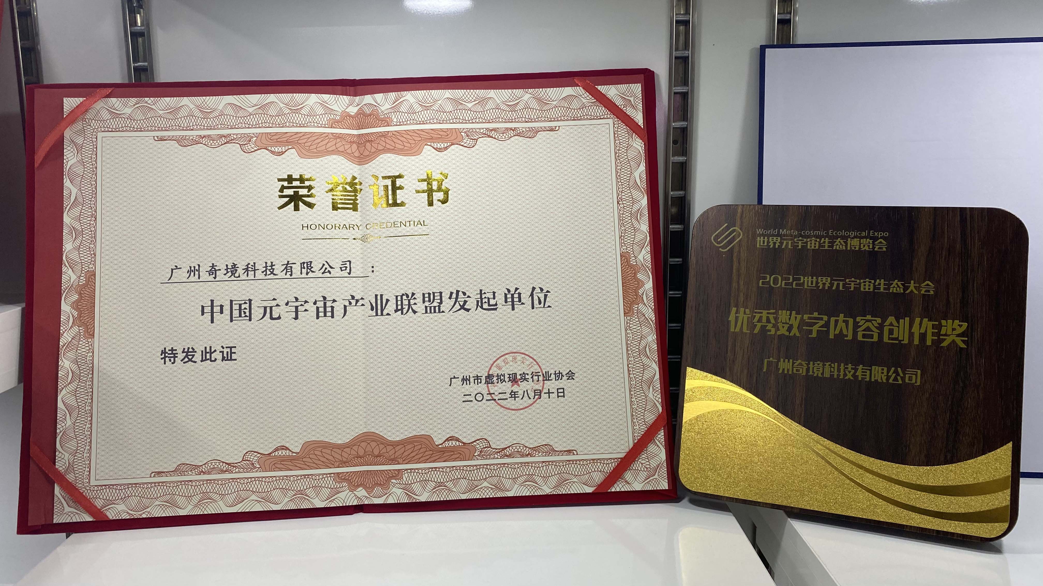 于本次展会中,奇境科技荣获中国元宇宙联盟发起单位荣誉证书以及2022年元宇宙生态大会优秀数字内容创作奖。