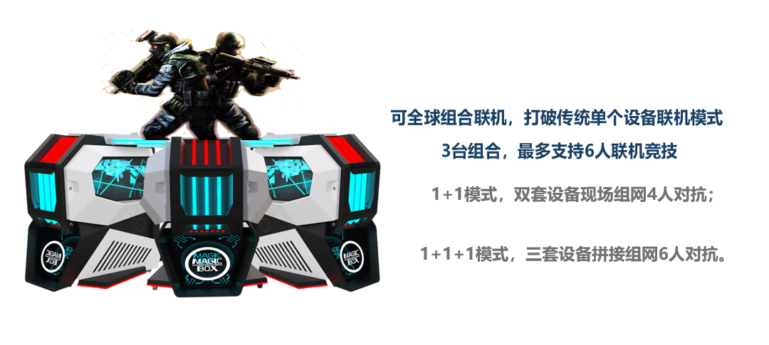 可全球组合联机,打破传统单个设备联机模式;台组合,最多支持6人联机竞技;1+1模式,双套设备现场组网4人对抗;1+1+1模式,三套设备拼接组网6人对抗。