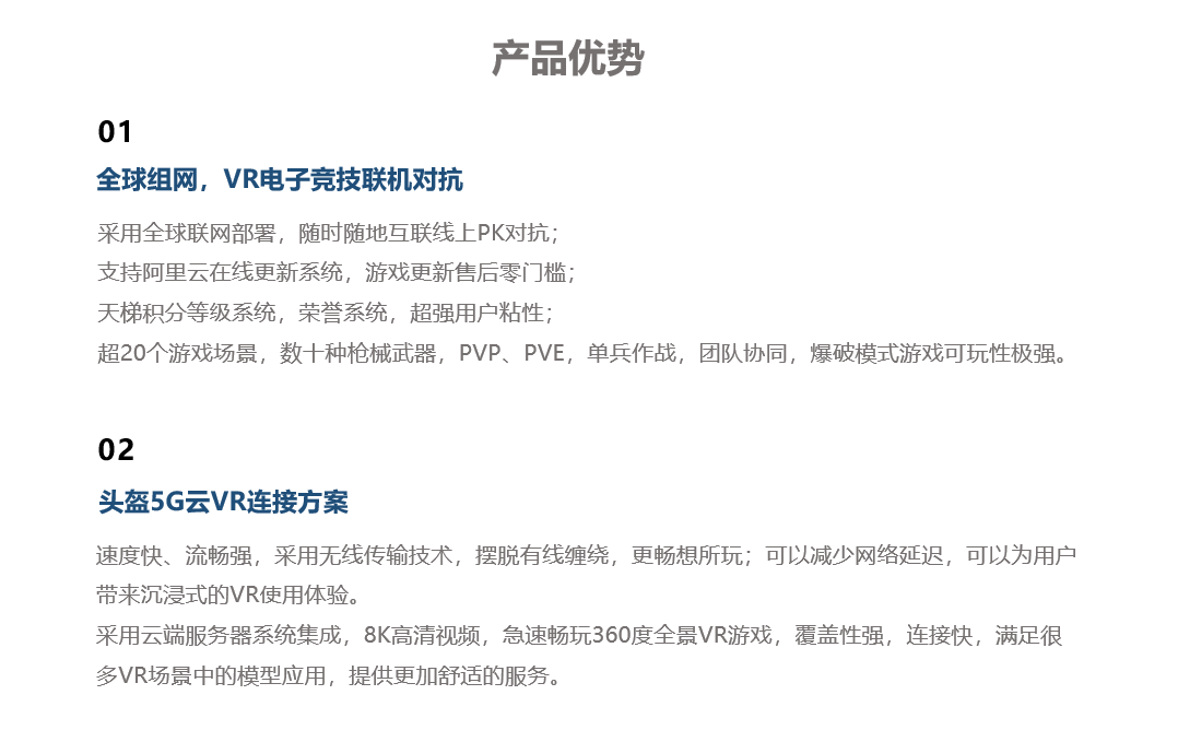 全球组网,VR电子竞技联机对抗;头盔5G云VR连接方案;强大兼容性,自主添加多款热门单机游戏