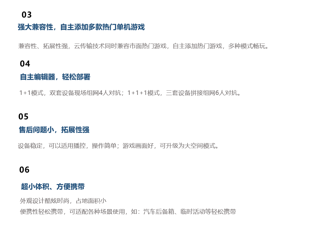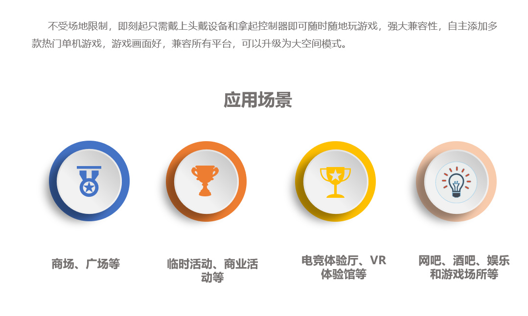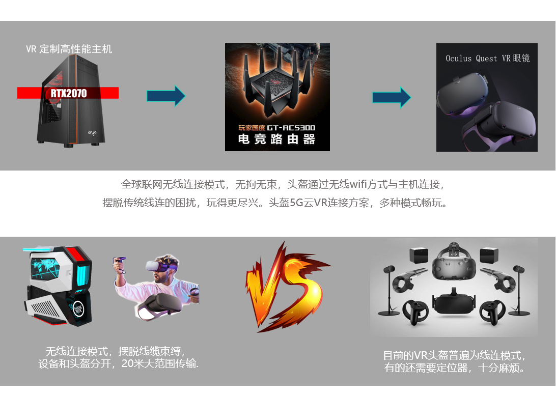 全球联网无线连接模式,无拘无束,头盔通过无线wifi方式与主机连接,摆脱传统线连的困扰,玩得更尽兴。头盔5G云VR连接方案,多种模式畅玩。不受场地限制,即刻起只需戴上头戴设备和拿起控制器即可随时随地玩游戏,强大兼容性,自主添加多款热门单机游戏,游戏画面好,兼容所有平台,可以升级为大空间模式。
