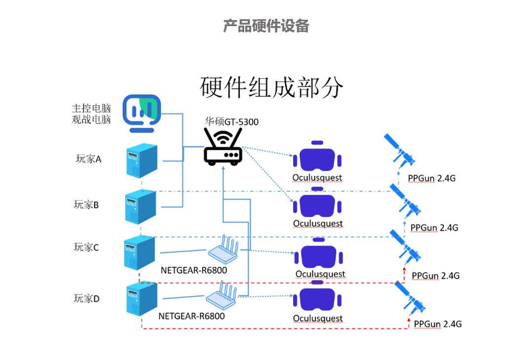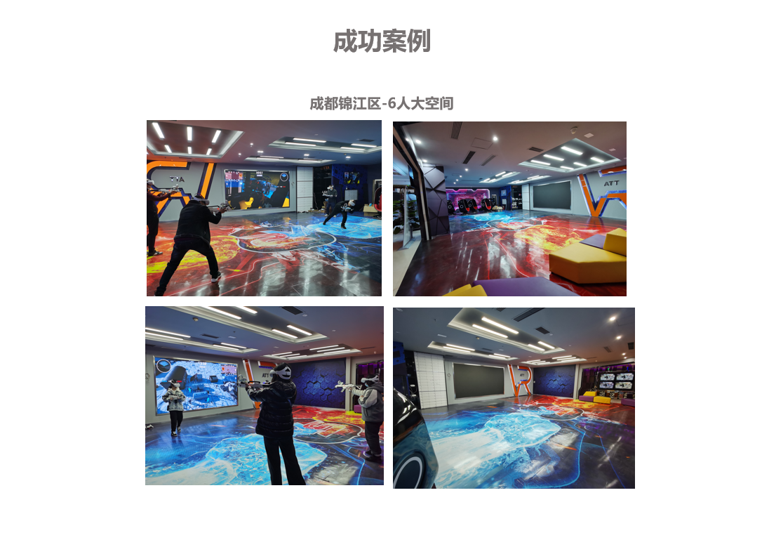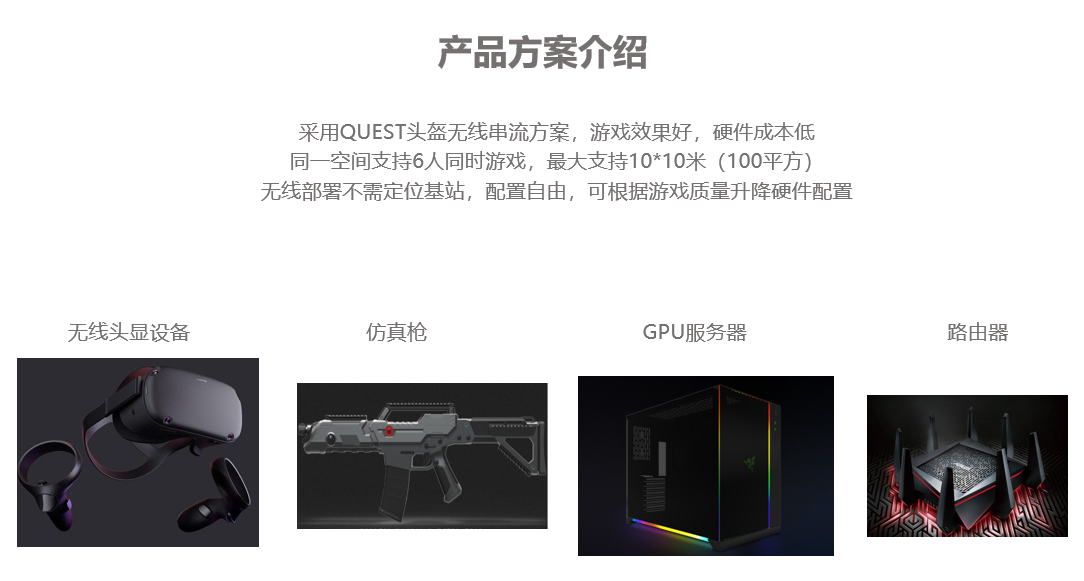 采用QUEST头盔无线串流方案,游戏效果好,硬件成本低;同一空间支持6人同时游戏,最大支持10*10米(100平方);无线部署不需定位基站,配置自由,可根据游戏质量升降硬件配置