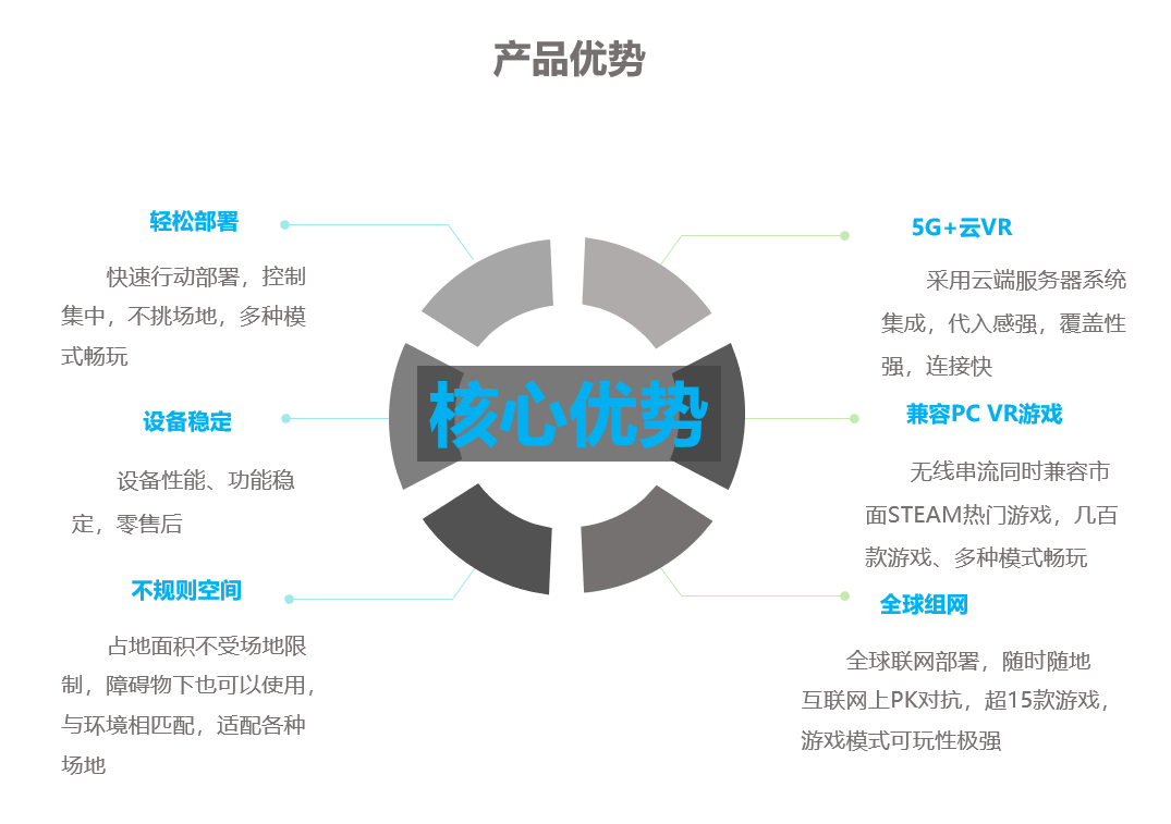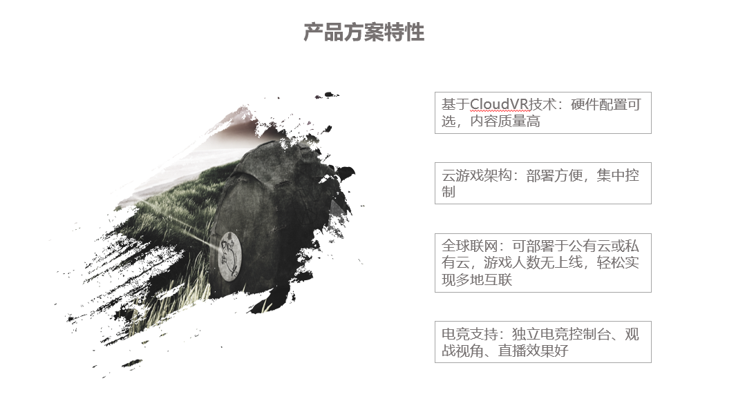 基于CloudVR技术:硬件配置可选,内容质量高;云游戏架构:部署方便,集中控制;全球联网:可部署于公有云或私有云,游戏人数无上线,轻松实现多地互联;电竞支持:独立电竞控制台、观战视角、直播效果好
